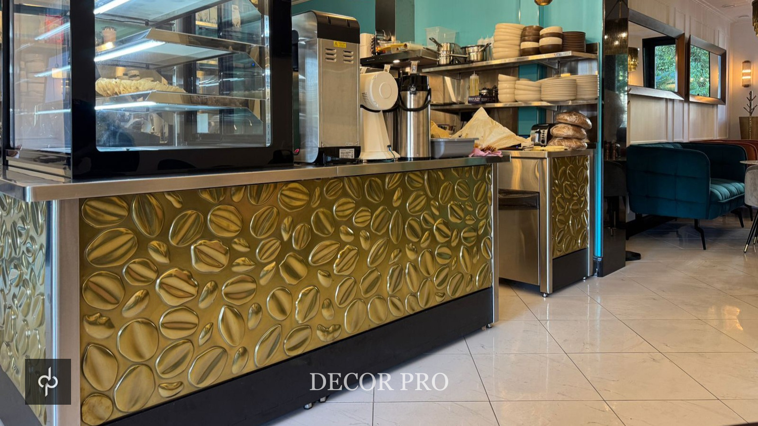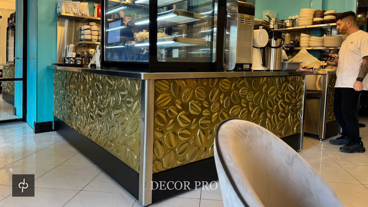 Композитная облицовка барной стойки, в виде кофейных зёрен, металлизированная жидким металлом PRO-METAL 2K с эффектом полированной латуни, 2025г.